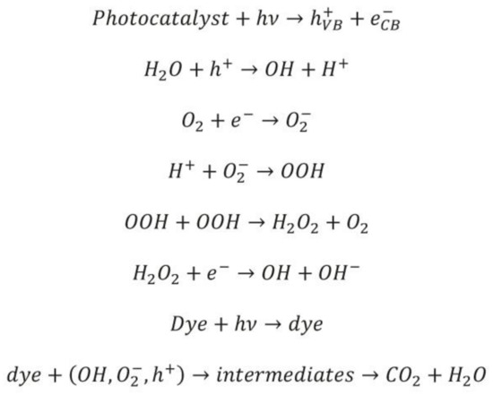 Various biological, chemical and physical experiments have been conducted for photodecomposition of synthetic and organic dyes [4,5,6,7,8,9,10,11]. Recently, advanced oxidation methods have been the talk of the scientific community searching for cost-effective and efficient degradation of dyes present in effluents. The metal oxide-based semiconductor photocatalysts for decomposition of noxious dye molecules have drawn the interest of researches as a potential process to resolve a tremendously increasing issue of water contamination due to deleterious organic dyes. Moreover, due to the photosensitive nature of the materials with semiconductor properties, the oxidative degradation of the polluting dye can be performed in sunlight or UV light.