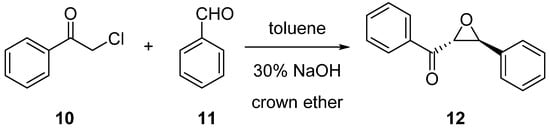 One of the asymmetric reactions was the base-initiated Darzens condensation of 2-chloroacetophenone (10) and benzaldehyde (11) (Scheme 3). The synthesis resulted in chiral epoxide 12 with complete diastereoselectivity, while a new C-C bond was established. The absolute configuration of epoxyketone 12 was previously assigned as 2R,3S [63,70]. Using chiral crown ethers 1a–c, full conversion was reached within one hour, as was the case with benzylidene analogues 2a–c (Table 1). The same trend was observed for both series of macrocycles. The best enantioselectivity was provided by catalysts 1a and 2a bearing a hydroxypropyl sidearm (52% and 62%, Table 1, entries 1 and 4). When a methoxypropyl group was present, the asymmetric induction decreased to 29% (1b) and 21% (2b), respectively (Table 1, entries 2 and 5).