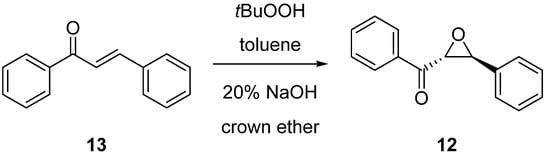 Epoxidation of chalcone (13) with tert-butyl hydroperoxide in the presence of sugar-based crown ethers (1 or 2).