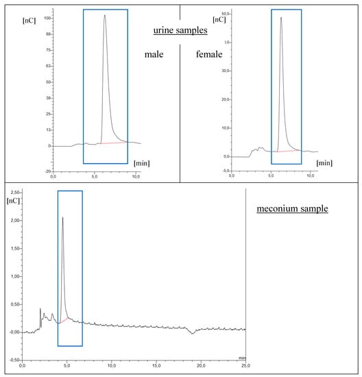 Example chromatograms of a tested smoker’s urine (father 21.91 µg L−1, mother 8.69 μg CN− L−1), and a meconium sample (control group 4.09 µg L−1).