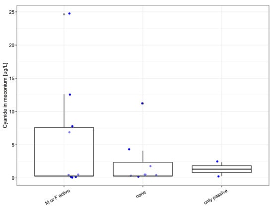 Smoking habits of the father or mother (F or M)—influence on the child’s meconium cyanide concentration. Differences between groups were not significant (Kruskal–Wallis ANOVA p = 0.76).