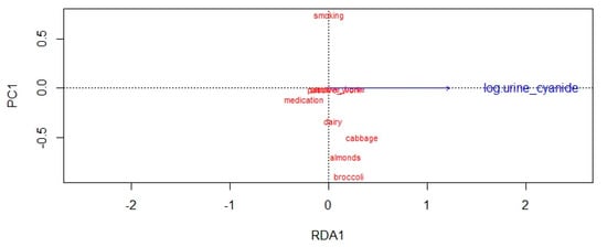 Another interesting variant which potentially affects the results is the diet. There was a slight tendency noted for higher median concentrations of cyanide in the urine of parents whose diet was rich in broccoli, cabbage, or almonds, yet none of these tendencies produced a significant inter-group effect which would correspond to the Kruskal–Wallis ANOVA p-value < 0.05. We performed a redundancy analysis to test the influence of dietary, medical, and habitual (smoking) factors upon the cyanide concentrations in the urine of studied adults, but the influences were mild at most (Figure 4). A non-parametric significance test in fathers and mothers as separate groups yielded significant differences only for cabbage in the group of mothers and broccoli among the fathers group (as measured with U Mann–Whitney test).
