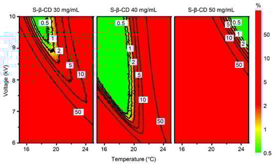 Zhang et al. developed a CE method for the chiral separation of tamsulosin, an α1 receptor antagonist, used in the treatment of benign prostate hyperplasia in the form of pure enantiomer, S-tamsulosin. S-β-CD was chosen as CS. Response surface methodologies such as BBD, FCCD, and central composite circumscribed (CCC) design, were comparatively used for the optimization. CD concentration, voltage and temperature were chosen as variable factors, and their influence on chiral resolution and migration time was observed. The design points for all three approaches are guaranteed to fall inside a safe operating zone, with similar optimization and prediction results. Baseline separation of the enantiomers was obtained quickly during 3 min, with a resolution higher than 1.5 [75]. The study confirms the principle that the applied three response surface designs can serve as alternatives to each other.