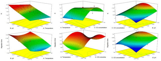 Perrin et al. studied the effects of peak measurement and analysis parameters on chiral CE, using as model compound an H1 antihistaminic derivative, dimethindene. The influence of parameters related to UV detection (detection and reference wavelengths, detection, and reference wavelength bandwidths), signal processing (data acquisition rate, filter, and filter peak width), and peak detection (detection threshold, peak width) on chiral resolution, peak area, and signal-to-noise (S/N) ratio, were studied at two different concentrations levels (high and low S/N ratio) using a DoE strategy. A D-oD was first used for screening the nine factors in ten experiments to identify the most significant parameters, followed by a FCCD for modelling different responses as a function of significant parameters, namely data acquisition rate, filter, and filter peak width. The results revealed that when designing a CE separation, signal-processing parameters should be carefully chosen because setting these parameters at various levels will cause significant differences in the measured separation, the S/N ratio, and the peak area [68]. Interestingly, peak measurement/analysis parameters should be optimized as much as the method’s chemical and physical parameters, since significant improvements in impurity detection and/or identification, which is a crucial aspect in CE, can be achieved. The study also points out that the robustness of a system can be severely harmed when the parameter settings are transferred from one instrument to another.