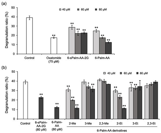 Inhibitory effects of 6-Palm-AA (a) and 6-Palm-AA derivatives (b) on antigen-induced degranulation. DNP-IgE-sensitized RBL-2H3 cells were incubated with the indicated samples and stimulated with DNP-HSA. All data represent the means ± SD of three independent cultures. * p < 0.05 and ** p < 0.01 (Dunnett’s test) as compared with the control.