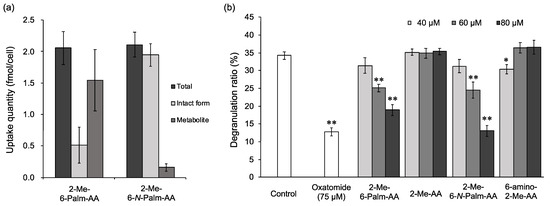 Uptake quantities of 6-Palm-AA derivatives into RBL-2H3 cells (a) and the inhibitory effects of 2-Me-6-Palm-AA, 2-Me-6-N-Palm-AA, and their metabolites on antigen-induced degranulation (b). All data represent the means ± SD of three independent experiments. * p < 0.05 and ** p < 0.01 (Dunnett’s test) as compared with the control.