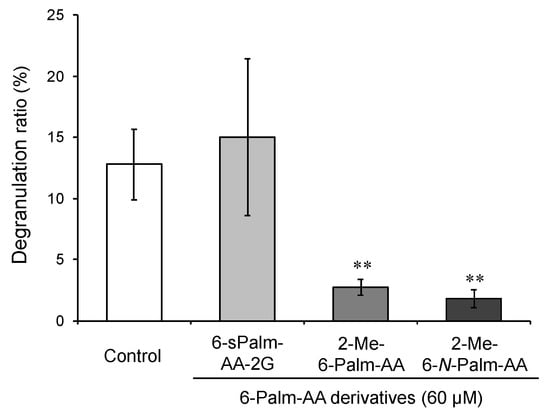 Structures of 6-Palm-AA derivatives with different substituents at the C-2 or C-3 position (a) and the inhibitory effects of the 6-Palm-AA derivatives on antigen-induced degranulation (b). All data represent the means ± SD of three independent experiments. ** p < 0.01 (Dunnett’s test) as compared with the control.