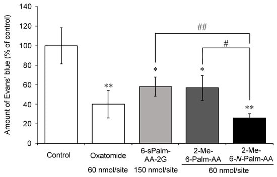 Inhibitory effect of 2-Me-6-N-Palm-AA on the antigen-stimulated PCA reaction in mice. Mice were percutaneously administered the indicated samples: control (n = 9), oxatomide (n = 9), 6-sPalm-AA-2G (n = 9), 2-Me-6-Palm-AA (n = 7), and 2-Me-6-N-Palm-AA (n = 8). All data represent the means ± SE. * p < 0.05 and ** p < 0.01 (Dunnett’s test) as compared with the control. # p < 0.05 and ## p < 0.01 (t-test).