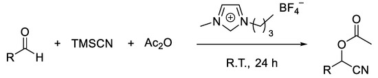 - Shen, Z.L.; Ji, S.J. Ionic liquid [bmim] BF4 as an Efficient and Recyclable Reaction Medium for the Synthesis of O-acetyl Cyanohydrins via One-Pot Condensation of Aldehydes, TMSCN, and Ac2O. Synth. Comm. 2009, 39, 808–818. [Google Scholar] [CrossRef]