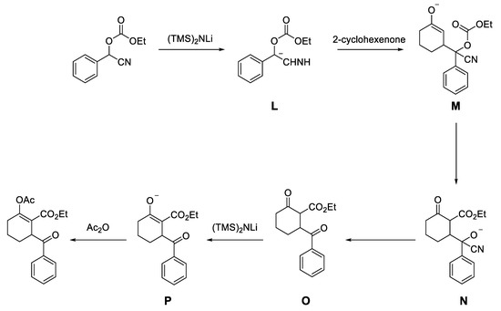 - Torres, H.M.; Maldonado, L.A.; Le Lagadec, R. Tandem Michael Addition-Claisen-type Condensation of Anions of O-ethyl Carbonates of Cyanohydrins to Cyclohex-2-en-1-one. Synth. Comm. 2017, 47, 1250–1255. [Google Scholar] [CrossRef]