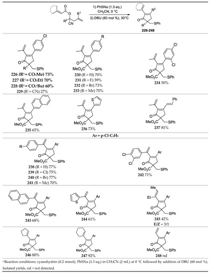 - Jiao, L.C.; He, Z.Y.; Liao, W.W. Sulfa-Michael Addition Initated One-pot Tandem Sequence: Construction of Highly Substituted 2-cyclopentenones from Allylic Cyanohydrins. Tetrahedron 2020, 76, 130922. [Google Scholar] [CrossRef]