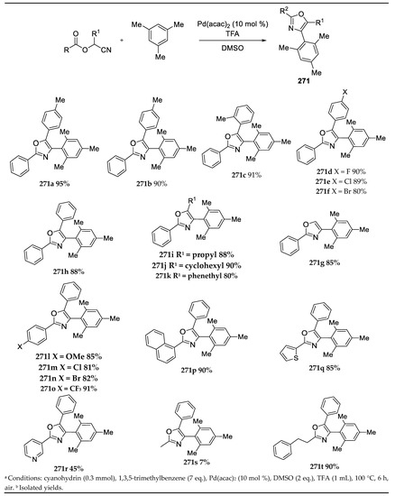 - Dai, L.; Yu, S.; Shao, Y.; Li, R.; Chen, Z.; Lv, N.; Chen, J. Palladium-catalyzed C-H Activation of Simple Arenes and Cascade Reaction with Nitriles: Access to 2,4,5-trisubstituted Oxazoles. Chem. Comm. 2021, 57, 1376–1379. [Google Scholar] [CrossRef]