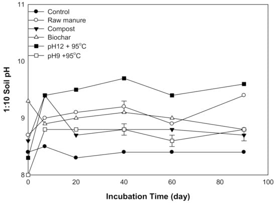 Variation in soil pH treated with different organic amendments derived from cow manure at different incubation times.