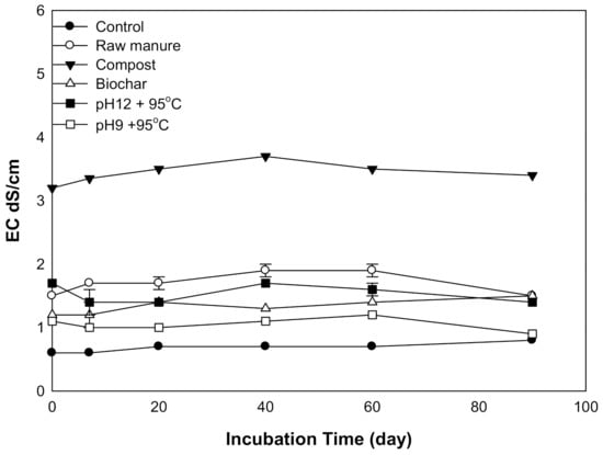 There was a statistically significant difference in soil EC due to the addition of the different amendments. The incubation time did not affect soil EC. The application of various organic amendments resulted in an initial rise in soil EC, followed by a steady EC afterward. All amendments to EC were less than 2 dS m−1 except for CMC, which was 3 dS m−1 (Figure 2). The soil incubated with CMC showed the highest EC. The soil EC of CMB was increased during 0–40 days. The CMSAEs showed less EC, as compared to CMC, but similar to that of the CMB. Higher CM soil EC related to initial EC. The increase of soil salinity due to the application of cow manure was reported by [34]. They considered manure as an essential source of soil salinity. The same observation was reported by [35], who found that huge manure quantities induced soil salinity. These quantities increased salt content and soil EC. CM can increase salinity due to the presence of water-soluble nutrients such as ammonium, Na, Ca, Mg, K, Cl, SO4, and HCO3, as well as the use of nutritional salts (NaCl).