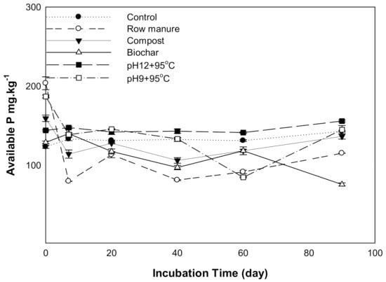 The results for available phosphorus (P) affected by different organic amendments derived from CM are shown in Figure 3. There was a statistically significant difference in available P as a result of organic amendments and incubation time. The available P in soils treated with CM, CMC, and CMSAE (pH 12) decreased between 0 to 7 days and then tended to increase as the incubation time increased. This decrease may result from CaCO3, which has been reported to retain P as dicalcium phosphate and octacalcium phosphate [36]. Soil treated with CMSAE (pH 12) showed the highest available P between days 20 to 90. This increase in soil available P might be due to the high humic acid content in manure effluents, compared to CM and CMB, as found by [37]. They indicated that the presence of humic acid slows the precipitation of poorly soluble Ca phosphates.