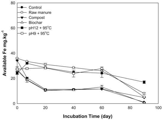 There was a significant difference in soil available Fe as a result of the addition of organic amendments. The Fe declined as incubation time decreased (Figure 4). The Fe content values are plotted in two areas: sharp Fe decrease, in CMC and CMB, and gradual Fe decrease, in CMSAEs and CM. After 60 days, Fe content depleted to the lowest value for all treatments. The Fe content of soils treated with CM and CMSAEs was higher, compared to other amendments. This may be related to the high Fe content of CM, and CMASEs had high humic substance content that may contribute to Fe availability via the formation of water-soluble Fe–humic substance complexes, which quickly move in the soil [39]. Uptake of 59Fe from 59Fecomplex has been measured even at pH values compatible with those found in calcareous soils [40]. However, calcareous soils tend to reduce Fe availability due to high pH in this soil [41,42]. The high pH increases the hydroxyl functional group, and subsequently, Fe hydroxide precipitates [43].