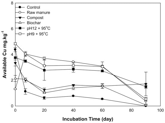 There was a significant difference in soil Cu availability as a result of organic amendments. The available Cu declined with increasing incubation time. The soil amendments could be divided into two groups according to soil available Cu curves: Group one includes CMC and CMB and is characterized by a sharp decrease in available Cu, while group two has CM and CMSAEs and is characterized by a gradual reduction of available Cu. Between 0 to 20 days, Cu decreased in all amendments except CM; afterward, available Cu was almost stable until 60 days, and then its content decreased at 90 days (Figure 5). The high available Cu at the beginning is explained by low soil pH, as shown in Figure 1. On the other hand, the available Cu of CMSAE-treated soils was higher than that of CMC and CMB; this might be due to the temperature of CMSAEs preparation, which promotes the degradation of Cu binding compounds, consequently producing more Cu in soil solution [44].