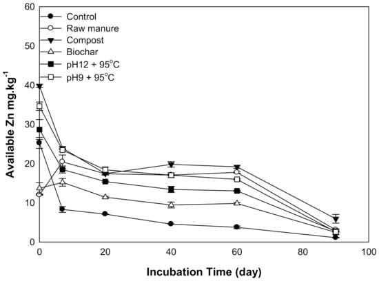 There were significant differences in Zn content was observed as a result of organic amendments’ application. Zn content generally declined with increasing incubation time (Figure 6). The highest recorded Zn content was (39.7 mg kg−1) for CMC treatment, while the lowest Zn content was (1.1 mg kg−1) in control soils after 90 days. Higher soil pH and CO3 content negatively affected Zn content and decreased its availability. Smith [45] showed that aerobic composting processes increased heavy metals’ stability through the formation of complexes with organic matter.