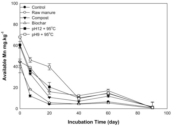 Higher Mn content was observed at the start of the incubation. Afterward, Mn concentration sharply decreased for all organic amendments in 20 days, except for a gradual decline for CMSAE (pH 9), which reached 9.6 mg kg−1 at 40 days. The highest Mn content was 86 mg kg−1, observed at CMSAE (pH 9), while the lowest available Mn concentration (0.38 mg kg−1) was observed in the case of CMB-treated soils at day 90. Available Mn was significantly reduced in CMB, compared to CMSAE (pH 9), at seven days incubation time. At the same time, its content decreased by 1:8 ratio at 20 days (Figure 7). Low Mn content may have resulted from the mass losses after the decomposition of organic matter [46]. Similar results were also obtained by Zeng et al. [43] who found the Mn content was below the critical level when soil pH was increased.