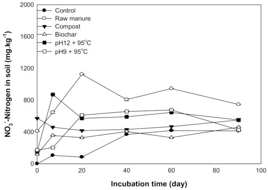 Environmental factors that affect ammonification and nitrification are temperature, water status, and C:N ratio [49,50]. Ammonium nitrification could be a reason for the increase in NO3− the content of soil incubated with an organic compound. The rise in nitrification at 60 days was also found by [51], who stated that the addition of poultry manure to soil resulted in NO3− accumulation at 60 says. This was mainly due to the increased activity of nitrifying bacteria. These findings agree with those results found by [52], who found that the ammonium content extracted from soil treated with fresh poultry litter declined during the first 30 days of incubation, and there was a rapid increase in NO3− contents.