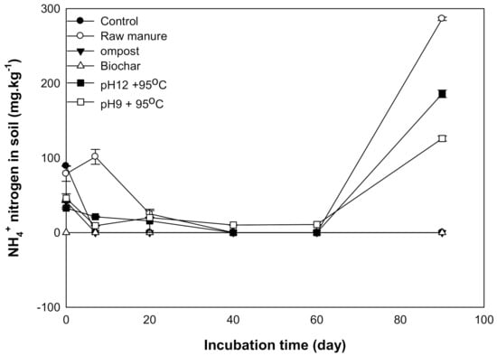 Ammonium nitrogen is considered one of the measurements for soil nitrogen availability to plants. The results showed that the addition of different organic materials caused a significant difference in extracted NH4+ nitrogen content. Directly after amendments incorporation, the available ammonium increased with a relatively high rate, as incubation time increased, the NH+ release rate tended to decrease; these results point out the added manures increased available NH4+.Extracted ammonium increased immediately after manure applications, which was also found by [55], who reported a concentration of 1100 mg kg−1 ammonium following manure application. Microbes degrade simple organic compounds such as simple carbohydrates and amino acids in a short time. Therefore, soil available ammonium increases [56].
