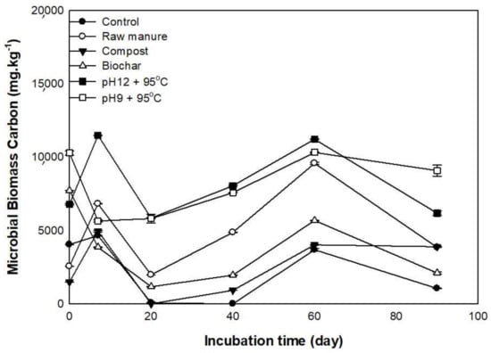 The increase of MBC indicated the presence of inorganic nitrogen and consequently high microbial activity, as suggested by [64], who showed the positive effect of organic materials on soil MBC. The soil microorganisms largely depend on easily degradable materials to increase their numbers and decompose more organic material. After 20 days of incubation, MBC content declined, probably due to the depletion of soluble organic carbon by microbes. The concentrated amino sugars, amino acids, proteins, and short-chain organic acids in CM [65] were reported to decompose fast in soil [66,67]. The low MBC in soils treated with biochar might be caused by the loss of many organic compounds that are consumed by microorganisms [25].