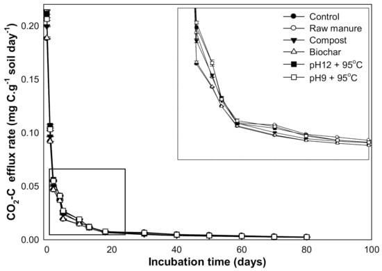 CO2 efflux rate (mg C/g soil/day) affected by different organic amendments derived from cow manure at different incubation times (marked box is magnified to show the trend).