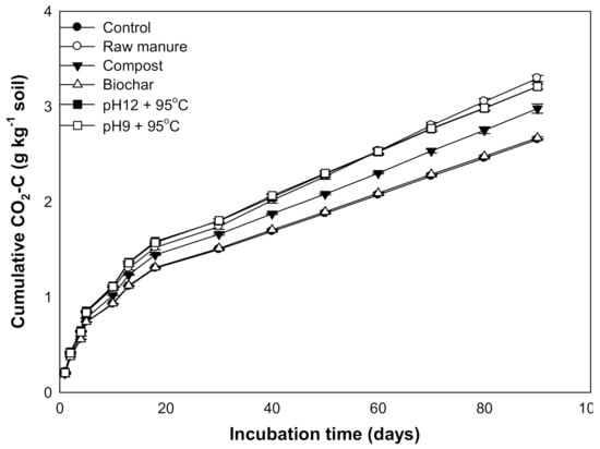 Furthermore, the soil CO2 efflux ranged from 0.231 to 0.001 g kg−1 soil. The high CO2 efflux was observed in the raw CM and CMSAEs of pH12 and T95 °C; the values accounted for 0.231 and 0.211, respectively. Moreover, the results reveal that the CMSAEs at pH 12 and pH 9 with T95 °C decreased the accumulated CO2 efflux, while the CMB showed the smallest efflux value (19.8). Our study thus clearly indicates that the CMSAE did not reduce the accumulative CO2 efflux. Finally, the organic materials significantly affected the soil micronutrient cations (Fe, Cu, Zn, and Mn). The contents of available micronutrients were high at the beginning of incubation and then decreased over time.