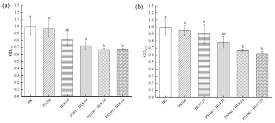 Inhibitory activity of PDI against S. saprophyticus biofilm formation under different CUR concentration (a) and light dose (b). BK: blank control; PS: photosensitizer treatment; BL: blue-light treatment; PS + BL: photosensitizer combined blue-light treatment. Values are presented as mean ± SD. Results marked with the same letters are not significantly different.