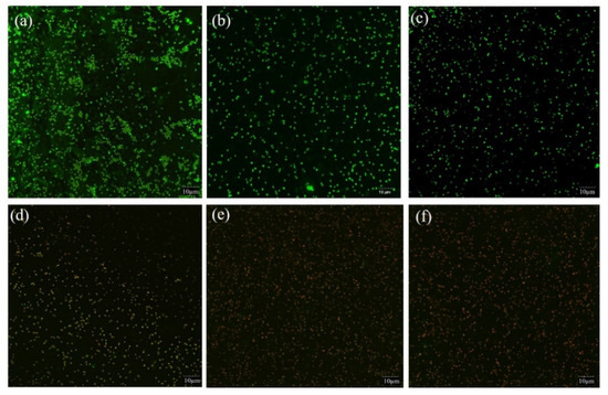 CLSM images of S. saprophyticus biofilm. (a) BK: blank control; (b) 100 μM CUR treatment only; (c) 17.28 J/cm2 irradiation treatment only; (d) PDI treatment with 100 μM CUR and 4.32 J/cm2 irradiation; (e) PDI treatment with 100 μM CUR and 8.64 J/cm2 irradiation; (f) PDI treatment with 100 μM CUR and 17.28 J/cm2 irradiation.