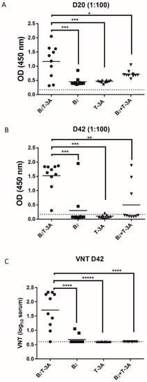 3.2. A Mixture of B2T-3A Dendrimers Harboring B-Cell Peptides from Different FMDV Serotypes Elicits Similar Titers of Type-Specific Neutralizing Antibodies