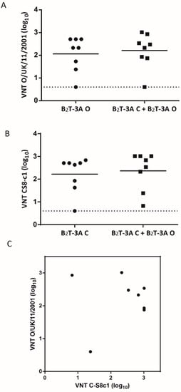 Homologous neutralization assays were used to determine the capacity of sera from Groups ii and iii above to neutralize C-S8c1 or O/UK/11/2001, respectively. In parallel, neutralization by sera from group i (B2T-3A mixture) was analyzed. In this experiment, no VNT were observed on day 21 pi (data not shown). When the capacity to neutralize type O FMDV was observed (day 40 pi), similar VNT titers were noticed in mice immunized with B2T-3A-O (group iii) or the B2T-3A mixture (group i) (2.1 ± 0.8 vs. 2.2 ± 0.8 log10) (Figure 2A). Likewise, animals in group ii (given B2T-3A-C) produced type C CS8-c1 VNTs similar to those in the B2T-3A mixture (group i) (2.2 ± 0.8 vs. 2.4 ± 0.8 log10) (Figure 2B). When the neutralizing activity against both viruses was compared, six out of eight animals (75%) showed high and similar titers against both serotypes, although the correlation was not significant (p > 0.5) (Figure 2C). Pearson’s correlation coefficient (r = 0.07) between titers to serotypes C and O in each animal suggested a similar response.