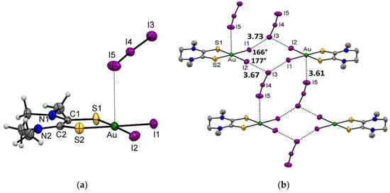 (a) Molecular structure of complex [Au(Me2pipdt)I2]I3 (1) with thermal ellipsoids plotted at the 50% probability level. (b) Portion of the crystal packing, showing intermolecular interactions as dashed bonds. Selected interaction distances (Å) and angles are indicated.