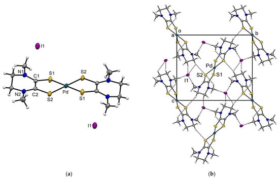 The crystal structure of the d8-metal [Pd(Me2pipdt)2](I)2 (2a) is shown in Figure 2 and the corresponding bond distances and angles are presented in Table 1. The asymmetric unit comprises half-complex cation and an iodide anion, whereas the overall molecular structure is represented by a square–planar cation and two iodide anions. The spherical charge distribution on I−, in contrast to the non-isotropic charge distribution on I3−, implies that I− is mainly involved in weak CH···I hydrogen bonds (HBs) (Figure 2) [37]. Additional weak CH···S HBs between symmetry related molecules contribute to the crystal packing, Figure S3.