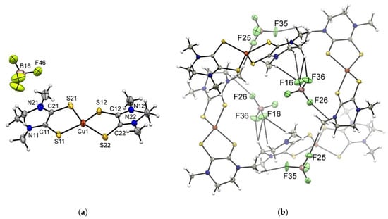 (a) Molecular structure of complex [Cu(Me2pipdt)2]BF4 (4) with thermal ellipsoids plotted at the 50% probability level. One molecular entity of the two comprising the asymmetric unit is reported for clarity. (b) Portion of the crystal packing, showing intermolecular interactions as dashed bonds.