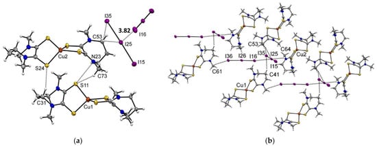 (a) Molecular structure of complex [Cu(Me2dazdt)2]I3 (5) with thermal ellipsoids plotted at the 50% probability level. (b) Portion of the crystal packing. Intermolecular interactions are depicted as dashed bonds. Halogen bond interaction is reported in Å.