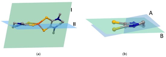 Depiction of the molecular planes used to calculate the dihedral angle between the S,S-chelate ligands (a) and between the thioamido groups (b). See also Tables S2 and S3.