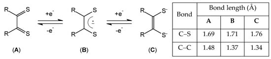 Reversible redox processes of α-dithiones and typical bond distances on the C2S2 moiety [26].