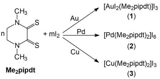 Reaction scheme for gold, palladium and copper powder dissolution by Me2pipdt/I2 mixtures. Reaction conditions: THF or CH3CN as solvent; room temperature; stirring. Complete leaching time: 1 h; Stoichiometry of product crystallization: (1) n = 1, m = 2.5; (2) n = 2, m = 3; (3) n = 2, m = 1.5.