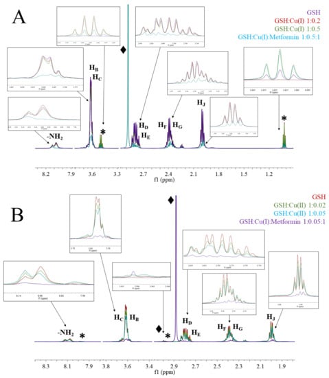 1H-NMR spectra of (A) GSH; GSH:Cu(I) 1:0.2; GSH:Cu(I) 1:0.5; GSH:Cu(I):metformin 1:0.5:1; (B) GSH; GSH:Cu(II) 1:0.02; GSH:Cu(II) 1:0.05; GSH:Cu(II):metformin 1:0.05:1; at pH 7.4 and under argon conditions. The regions’ ppm without signals were removed from the figure for simplicity.