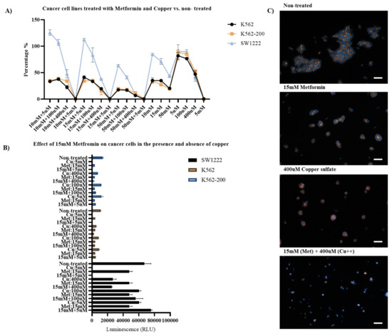 Effects of copper (II) on the anticancer properties of metformin. (A) ATP luminescence readings from SW1222, K562, and K562-200 cell lines treated with metformin and copper, normalized against untreated cells. (B) Comparison between the effects of either metformin, copper sulfate, or metformin and copper sulfate combined. (C) Fluorescent images of SW1222 cells showing the effect of 15 mM metformin, 400 µM copper sulfate, or both combined. (scale bar 100 µm).
