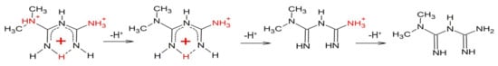 Based on the results presented here, a new metformin dissociation model can be proposed (Scheme 2). The lowest pKa (2.67) can be attributed to the NA proton, which leads to a shift of adjacent methyl protons and NB and ND protons (Figure 1). A further increase in pH leads to the second dissociation with a pKa value of 8.00, which could be assigned to the proton of NB, NC, or ND. The exact proton position is hard to ascertain, and the interconversion of different biprotonated forms may occur, and/or the proton is shared between NB and ND atoms in the pH range of 3.6–7.3 (Figure 1). The last dissociation, with a pKa value of 10.57, can be attributed to the terminal amine group (NE) and leads to the loss of positive charge. The change of charge from +1 to 0 leads to minor changes in the UV spectra (Figure 3), and no proton chemical shift can be observed due to absence of adjacent protons or hydrogen bonds stabilizing proton positions in our 1H-NMR experimental conditions.