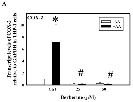 As shown in earlier scientific reports [23], AA treatment induced proinflammatory markers in THP1 cells by several folds compared to control cells (Figure 2). We tested the inhibitory effect of BBR (25, 50 µM) on AA-induced COX-2 and inflammatory cytokines using real time PCR and ELISA. Results clearly show the significant attenuation of the above markers by BBR at 25 and 50 µM. COX-2 transcript was upregulated to 7-fold by arachidonic acid when compared to control cells, whereas pretreatment with BBR significantly attenuated such induction of COX-2 at both 25 µM and 50 µM (Figure 2A). Upon induction with AA, cells increased the release of MCP-1 (74 pg/mL) and IL-8 (29 pg/mL). Pretreatment of cells with BBR significantly inhibited AA-induced release of MCP-1 (39 and 16 pg/mL) and IL-8 (20 and 15 pg/mL) (Figure 2B,C).