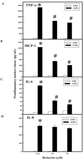 The activated monocytes secrete various proinflammatory cytokines and chemokines (e.g., TNF-α, IL-6, IL-8, and MCP-1) that play important roles in atherogenic lesions. LPS induced the secretion of TNF-α (2816 pg/mL), MCP-1 (1031 pg/Ml), IL-6 (134 pg/mL), and IL-8 (308 pg/mL) by several fold in THP-1 cells. Pretreatment with BBR (25 µM and 50 µM) significantly attenuated LPS-induced secretion of TNF-α (1625 and 1467 pg/mL), MCP-1 (546 and 405 pg/mL), and IL-6 (64 and 46 pg/mL) at 25 and 50 µM, respectively, but did not show much protection towards IL-8 (295 and 279 pg/mL) as shown in Figure 3.