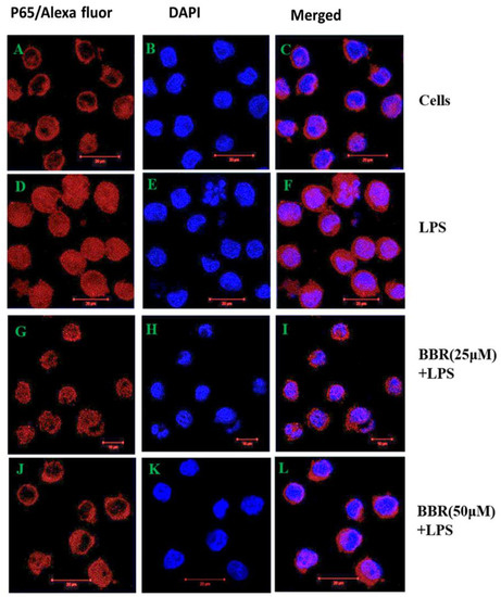 Effect of BBR on LPS-induced NF-κB P-65 subunit translocation. THP-1 cells were pretreated with BBR (25 and 50 μM) then induced with LPS (0.5 μg/mL), and the subcellular localisation of the p65 subunit was determined by the immunofluorescence technique. The NF-κB p65 subunit was stained with Alexa Fluor 594 conjugated secondary antibody and the nucleus was counterstained with DAPI. Images were captured under a confocal microscope (Zeiss, Germany). (A,D,G,J) are Alexa Fluor labelled cells; (B,E,H,K) are DAPI stained cells and (C,F,I,L) are merged images of Alexa Fluor and DAPI stained cells, respectively.