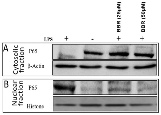 Further, immunoblotting analysis showed that the THP-1 cells stimulated with LPS translocated the p65 subunit of heteromeric NF-κB protein into the nucleus in contrast to the uninduced cells, which retained the p65 protein in the cytosol. Pretreatment of LPS-stimulated cells with BBR attenuated the p65 translocation, which was confirmed by the presence of p65 bands in the cytosol and marginally reduced band in the nucleus. Cytosolic and nuclear fraction protein samples were confirmed by the presence of the marker proteins GAPDH and histone, respectively (Figure 6).