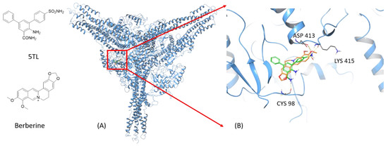 The protein-ligand docking studies were performed based on the cocrystal structure of human inhibitor of nuclear factor kappa-B (IκB) kinase subunit alpha (IKKα) and 5TL, a known inhibitor of IKKα [49] [PDB: 5EBZ [50]. The Schrodinger Molecular Modeling Suite 2020 was used for this modeling study (Schrodinger, Inc., New York, NY, USA), similar to what we have done in previous studies [PMID: 29406710; PMID: 22783954]. One hexamer was used for the preparation by the protein preparation wizard module in Maestro, during which bond orders were assigned, hydrogens were added to the PDB structure and the ionization state in pH 7.0 ± 2.0 was generated using the Epik module. The structures of 5TL and BBR were prepared by the Ligprep module with the OPLS3e force field. The receptor grid was generated using the Glide module. The sulfhydryl group in Cys98 and the hydroxyl group in Asp413 were allowed to rotate in order to sample their optimal orientations. Docking of 5TL and BBR were performed by ligand docking in the Glide module with standard precision followed by post-docking optimization [PMID: 29406710; PMID: 22783954].