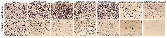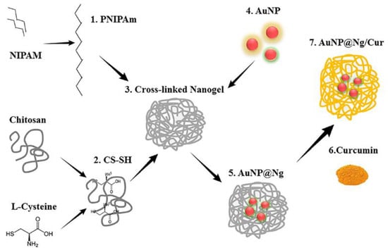Chitosan is particularly well-suited for action at low pH and cancer cells are generally more acidic than normal cells. Nanoparticles are well suited for drug delivery as they can be modified with molecules to allow for targeting to cancer cells [65]. When magnetic nanoparticles (such as Fe3O4) are incorporated into chitosan-based hydrogels, the hydrogels became responsive to the external magnetic field and could deliver therapeutic drugs with superior targeting and prolonged retention while avoiding excretion [66]. Recent work by Howaili et al. utilizes a nanogel of cysteine-modified chitosan grafted to PNIPAM and gold nanoparticles (AuNPs) (Figure 2) [67]. Curcumin, a bioactive compound with anti-cancer activity [68], was loaded within the nanogel. At physiological pH and room temperature, there were low levels (20%) of curcumin release from the hydrogel over 72 h. At pH 5.5 and 37 °C, this increased to 80% over 72 h. The use of nanoparticles allows for IR induced irradiation of the nanogels which enhances thermo-responsiveness [58]. This curcumin loaded-nanogel entered cells and were toxic against a breast cancer cell line. In this work, cells from an MDA-MB-231 breast cancer cell line were exposed to gold nanoparticles, the nanogel, and the curcumin-loaded nanogel respectively in the absence or presence of NIR laser irradiation at 808 nm (Figure 3). However, the most cell death was observed for the curcumin loaded-nanogel exposed to laser irradiation in dose-dependent manner indicating this combination of pH and NIR light, led to release of curcumin and induced cell death (Figure 3).