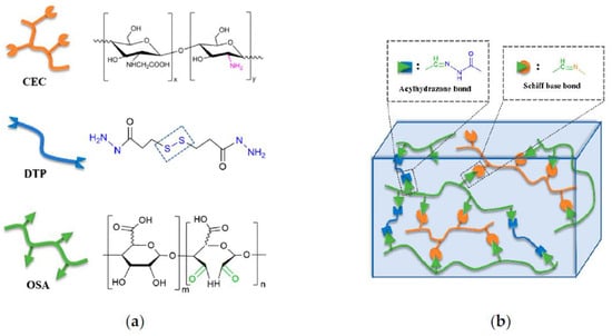(a) Structures and illustrations of carboxymethyl chitosan (CMC), 3,3′-dithiopropionic acid dihydrazide (DTP) and oxidized alginate (OSA); (b) schematic of crosslinking strategy (modified from [80]).