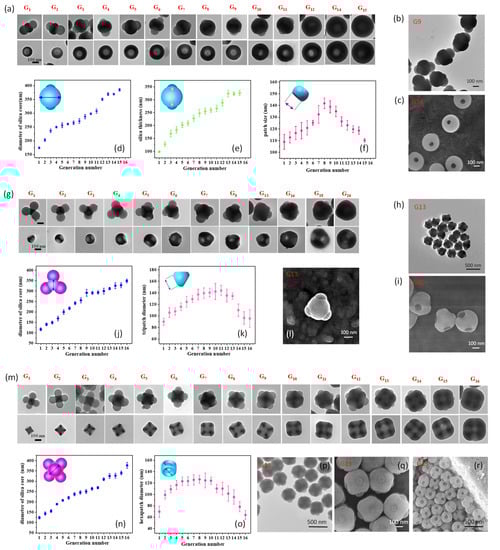 (a) TEM images of the bipod-like particles obtained after 1 to 15 iterative silica growth steps (corresponding to generations #1 to #15). The bottom row shows images of the corresponding two-patch particles obtained after dissolution of the PS nodules. All images are at the same scale; (b) Low magnification TEM image of the bipod-like particles after 9 iterative silica growth steps; (c) Scanning electron microscopy (SEM) image of the two-patch particles of generation #14; (d,e) Evolution of the diameter and the thickness of the silica core as a function of the generation number; (f) Evolution of the patch size as a function of the generation number; (g) TEM images of the tripod-like particles obtained after 1 to 20 iterative silica growth steps. The bottom row shows images of the corresponding three-patch particles obtained after dissolution of the PS nodules. All images are at the same scale; (h) Low magnification TEM image of the tripod-like particles after 13 iterative silica growth steps; (i) SEM image of the three-patch particles of generation #20; (j) Evolution of the diameter of the silica core as a function of the generation number; (k) Evolution of the patch size as a function of the generation number; (l) SEM image of a tripod-like particle of generation # 13; (m) TEM images of the hexapod-like particles obtained after 1 to 16 iterative silica growth steps. The bottom row shows images of the corresponding six-patch particles obtained after dissolution of the PS nodules. All images are at the same scale; (n) Evolution of the diameter of the silica core as a function of the generation number; (o) Evolution of the patch size as a function of the generation number; (p) Low magnification TEM image of the hexapod-like particles after 12 iterative silica growth steps; (q) SEM image of the hexapod-like particles of generation #13; (r) SEM image of the six-patch particles of generation #13.